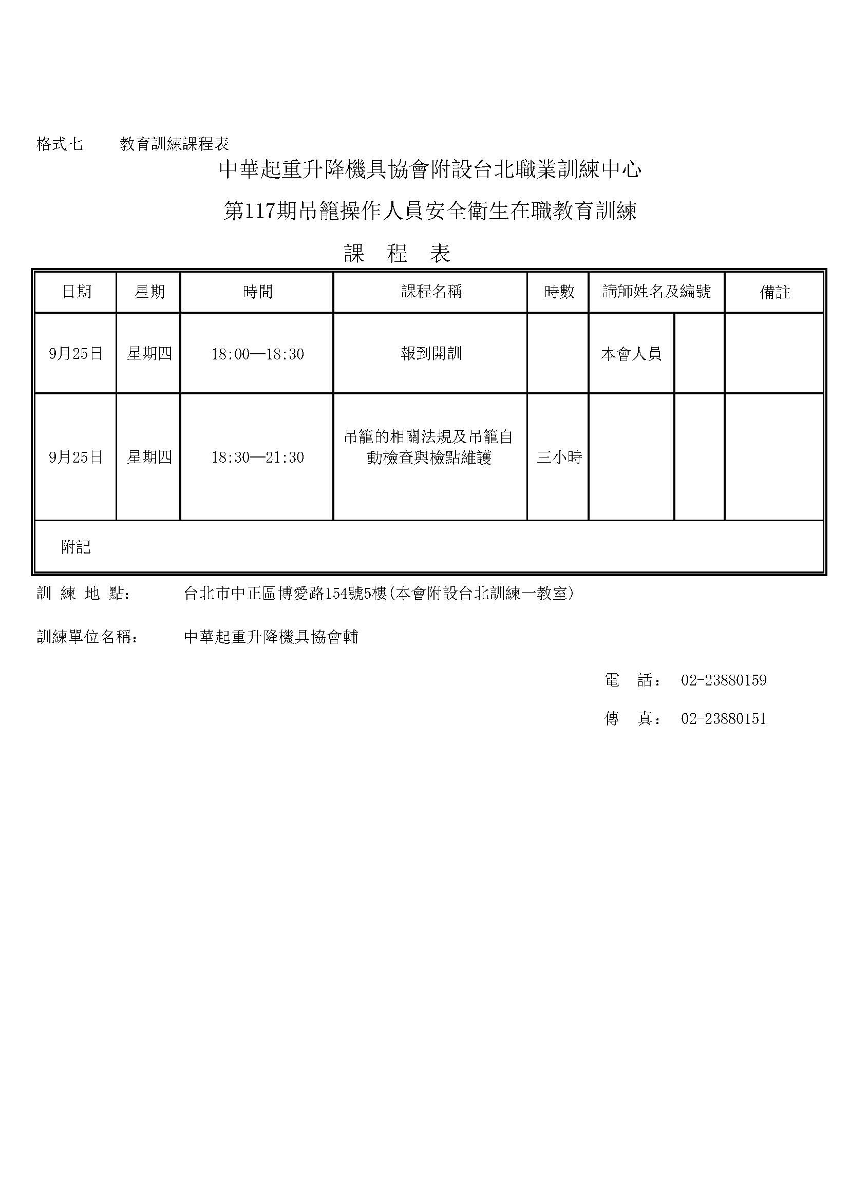 ( 本會附設台北訓練第一教室 ) - 訓練單位名稱:中華起重升降機具協會