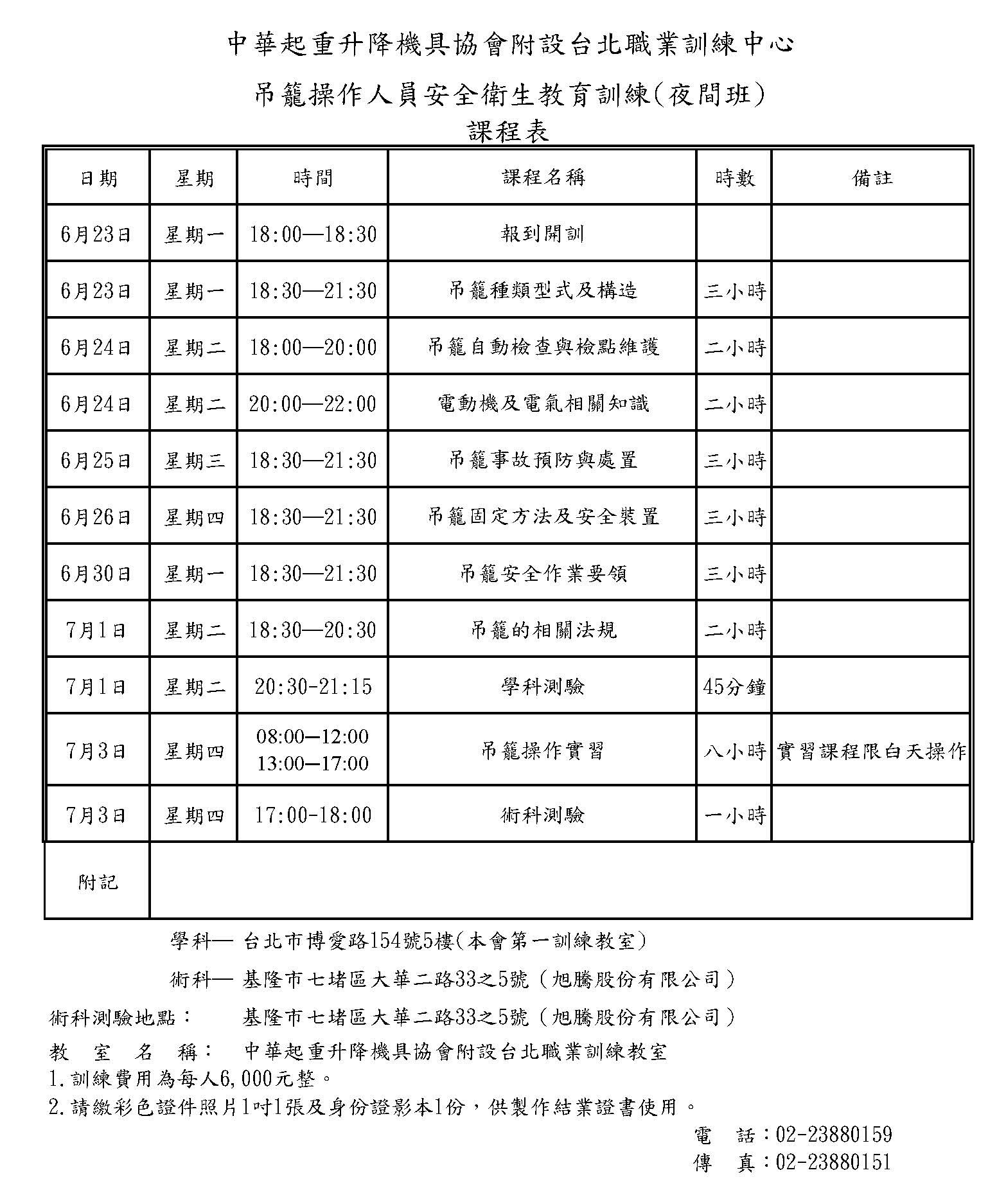 中華起重升降機具協會附設台北職業訓練教室 - 課程費用:每人 6000 元整