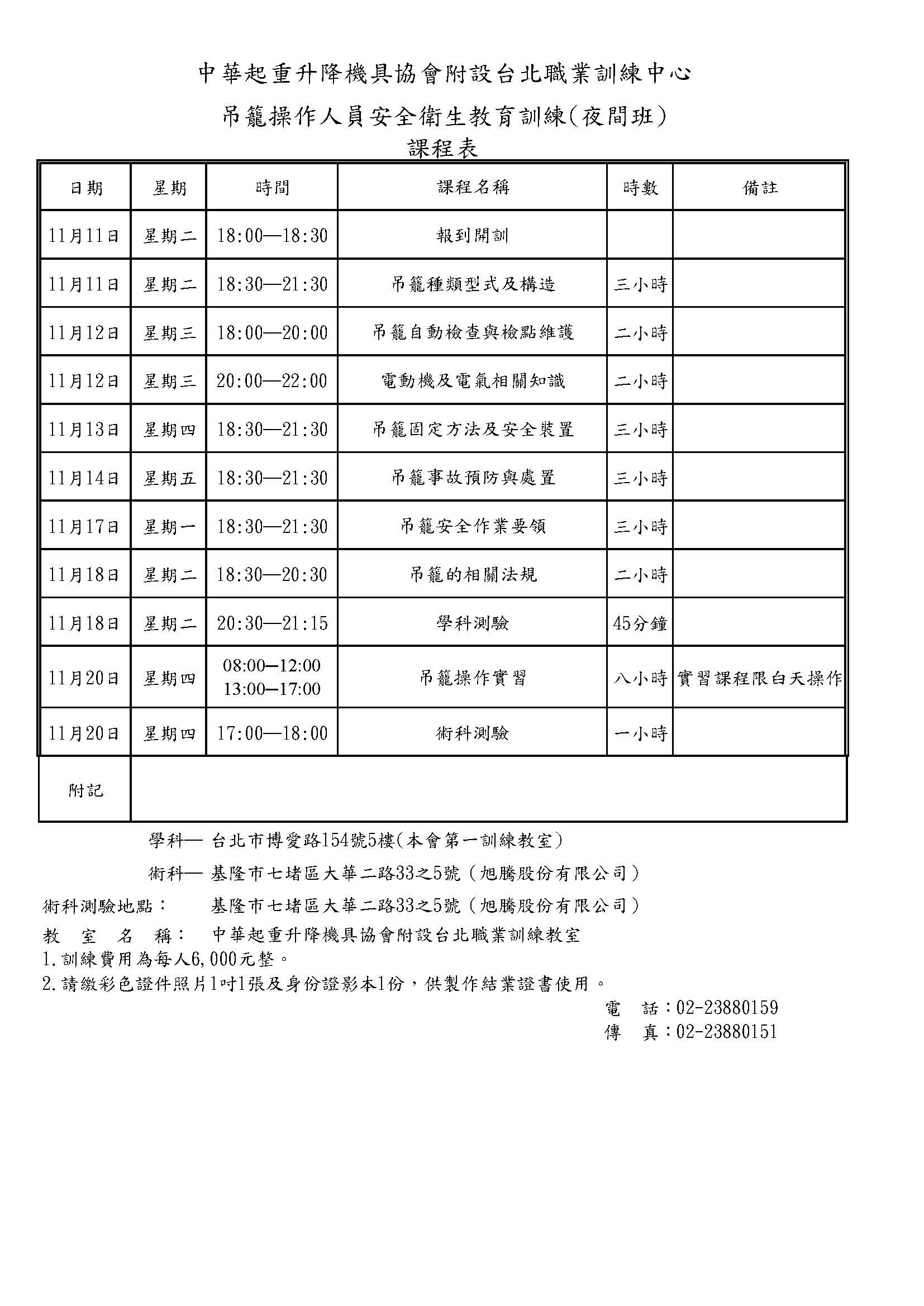 中華起重升降機具協會附設台北職業訓練教室 - 課程費用:每人 6000 元整